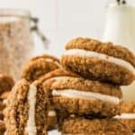 These Gluten Free Oatmeal Cream Pies feature a sweet, creamy filling sandwiched between two spiced oatmeal cookies. Quick and easy to make, they’re reminiscent of the classic Little Debbie treat – but better!
