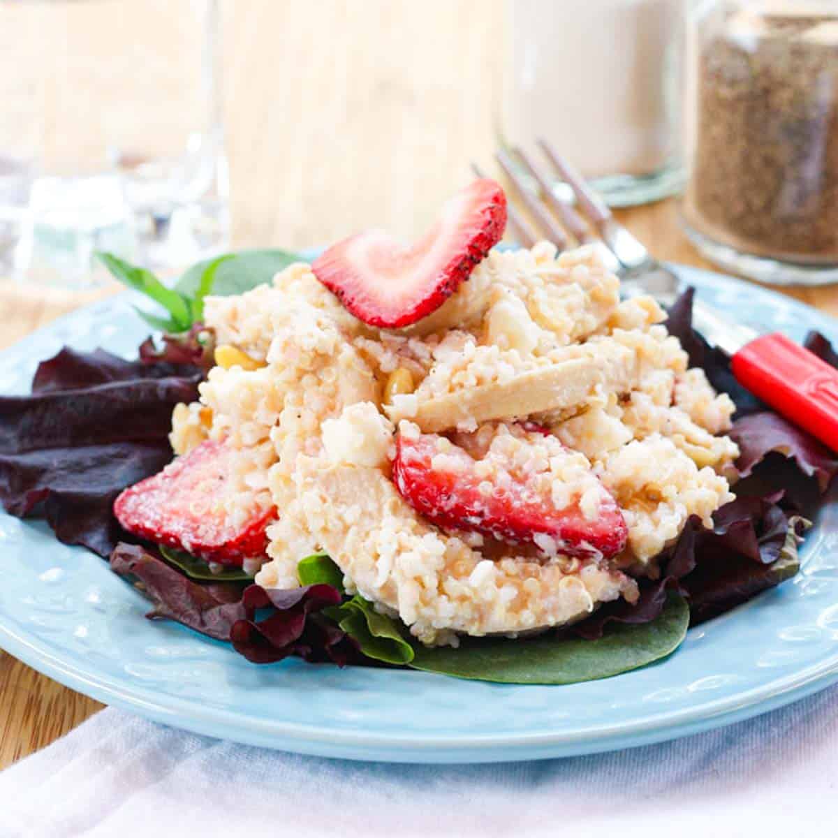 …Salad, but you’ll add fresh strawberries! Chicken, bacon, hard-boiled eggs and a mix of fresh vegetables make this into a complete meal. Get The Recipe Strawberry Quinoa Chicken Salad Sliced…